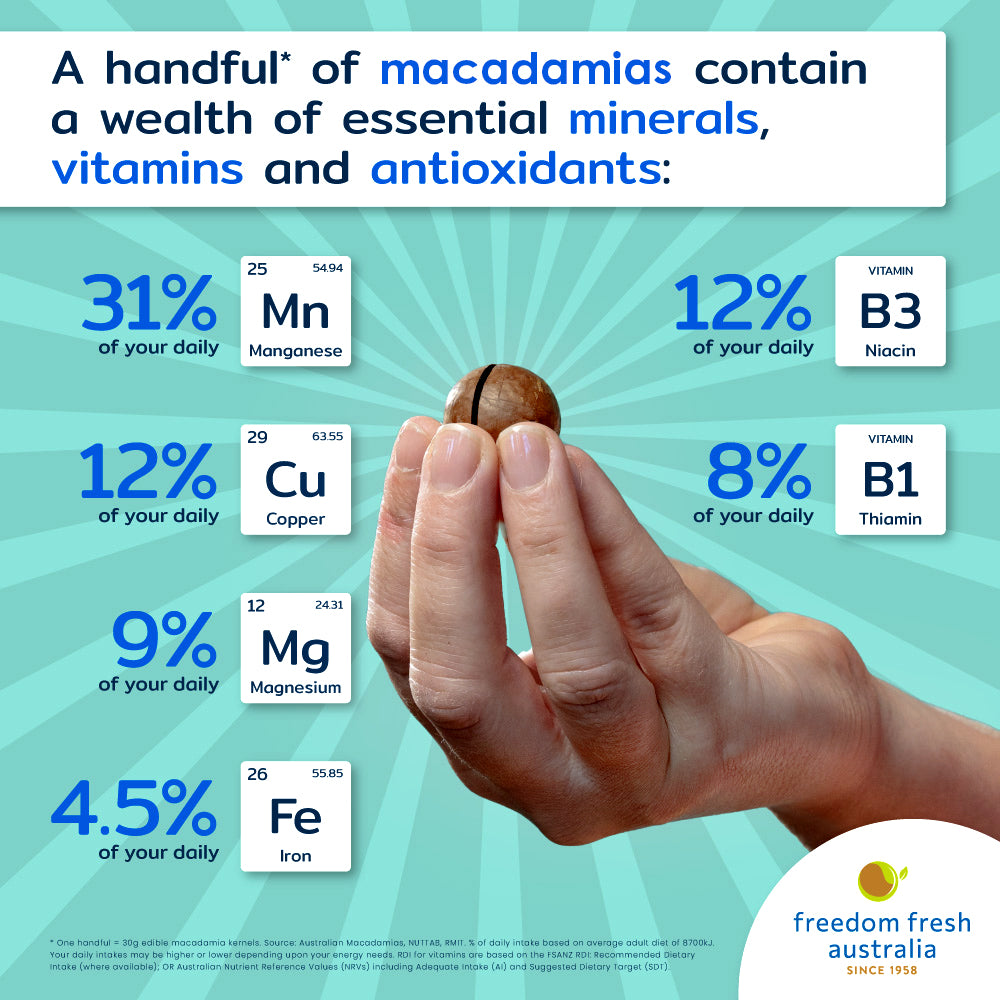 Just a handful (30g) of macadamia nuts contains your daily dose of essential vitamins and minerals.
